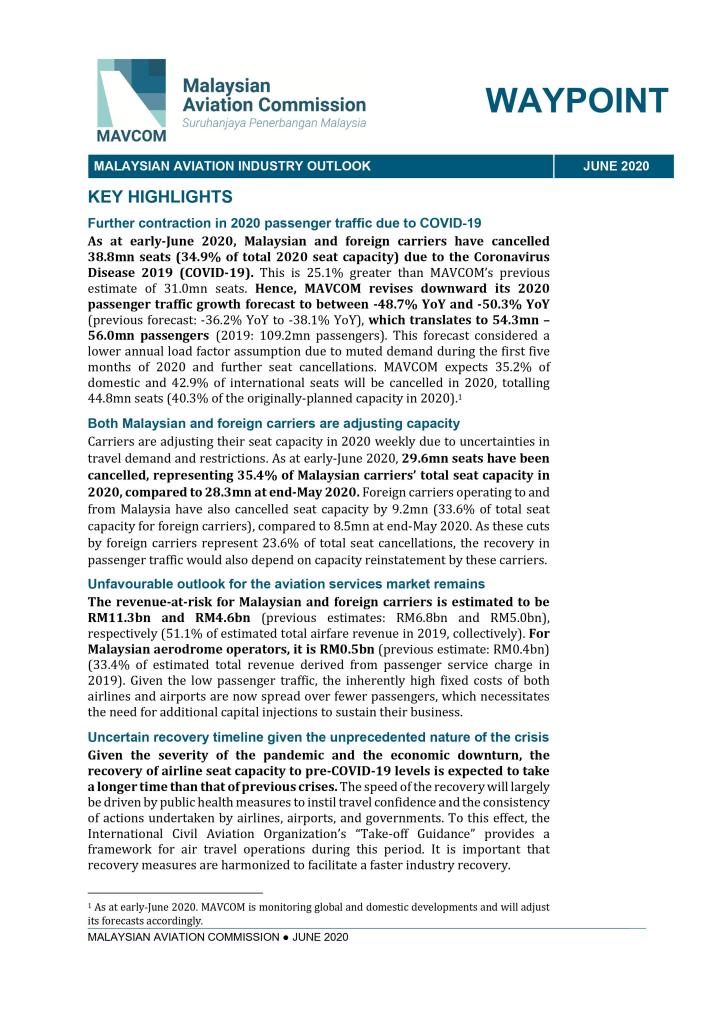 KUALA LUMPUR, 26 JUNE 2020: The Malaysian Aviation Commission (MAVCOM) published its seventh edition of Industry Report, Waypoint, providing last year’s overview on Malaysian aviation sector’s performance and the outlook for 2020.